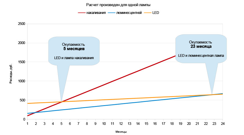 Окупаемость светодиодной лампы по отношению к лампе накаливания составляет 5 месяцев, по отношению к люминесцентной лампе - 22-23 месяца, т.е. менее 2 лет.